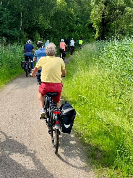 Die 44 km lange Rundtour führte die Gruppe zunächst auf gut befahrbaren Wegen und entlang blühender Gärten durch die reizvollen Kleingartengebiete Walle und Findorff. Unterwegs passierten sie die Waller Fleetkirche, eine ehemalige Notkirche für Kaisen Bewohner.
