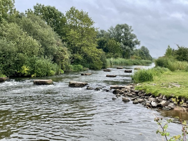 Die Route führte weiter in Richtung Weserwehr, wo seit gut einem Jahr ein faszinierender Insektenschaugarten zu bestaunen ist. Über das Wehr fuhren die Teilnehmenden durch das Naturschutzgebiet 'Neue Weser' und machten einen kurzen Halt bei den kleinen Stromschnellen, einer Fischtreppe am Zuleiter zum Werdersee.