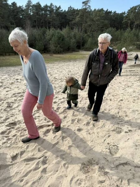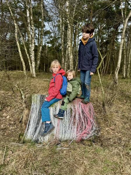 Inmitten dieser Dünen machten wir eine ausgedehnte Picknickpause und tauschten allerlei Leckereien aus. Die Kinder nutzten die Gelegenheit, um sich in den Sanddünen auszutoben und an den Kletterbäumen zu spielen. Sie legten die mitgebrachten Bewegungssteine an ausgewählten Stellen aus.