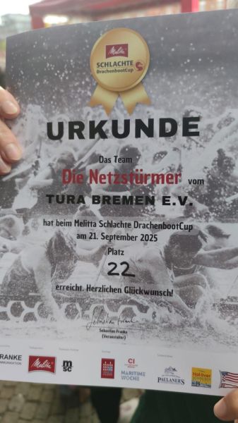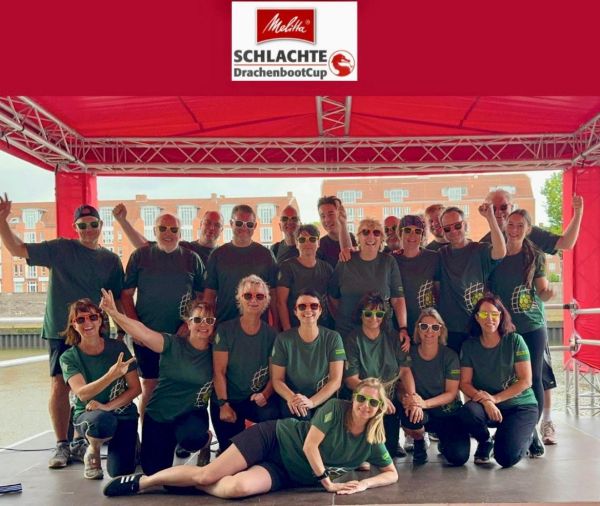 Die Badmintonabteilung, vielleicht genauer beschrieben die Handballerinnen unserer Abteilung, haben mit Unterstützung einiger ihrer Männer, unter anderem auch Abteilungsleitet Uwe Drewes, zum ersten Mal am Melitta Drachenbootrennen teilgenommen. Es waren 28 Boote dabei, vorwiegend von Firmen aus Bremen wie Melitta, Zech, Gewoba, Amazon… und von weiter her, aber auch beispielsweise die Pinken Deerns (eine reine Frauen Mannschaft mit Hintergrund Brustkrebs !!!) und natürlich die „Netzstürmer“ von Tura Bremen.