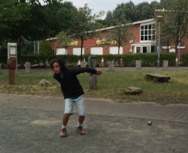 Beim Sommerferien-Programm auf dem Tura-Bouleplatz am Bert-Trautmann-Platz tauchte auch der 11-jährige Levin Flynn mit seinem Vater Matthias auf, die derzeit die Ferien für einen Besuch in der alten Heimat in Bremen-Findorff nutzen. Nach etwas Bedenkzeit wollte der Junge nicht nur einige Kugeln werfen, sondern gleich mit den parallel auf dem Platz spielenden Erwachsenen richtig mitspielen als Trieur (Schießer).