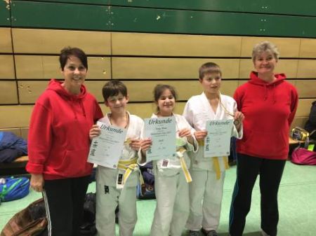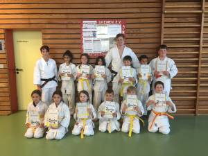 Neue Träger des gelb-orangen Gürtels (6. Kyu) sind Linus Benje, Jan-Henrick Juhls, Philip Nguyen und Richard Wenski. Den orangen Gürtel (5. Kyu) erhielt Joscha Trillhase. Den grün-orangen Gürtel (4. Kyu) erhielten Chantal Barten und Maurice Loock. Den blauen Gurt (2. Kyu) verdienten sich Sahin Yilmaz und Justus Kreutziger.