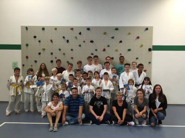 Die beiden Judo-Montagsgruppen von Tura mit den Prüfern Petra Wittmann-Richter und Tim Höwener