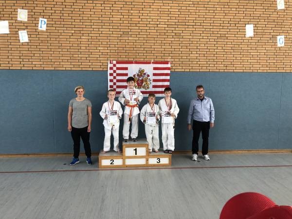 Erster Platz für Christopher Nelson von Tura Bremen, zweiter Platz für Marcel Burwieck von SHINTAI Bremervörde, dritter Platz für Artur Schlender von OT Bremen und Sebastian Seemann von PSV Bremen bei den Judo-Landesmeisterschaften.Links Tura-Trainerin Katja Leese und rechts Trainer Michael Buhlrich.