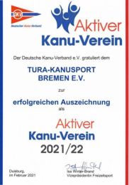 Die Kanuabteilung von Tura Bremen hatte sich für die neue Auszeichnung des Deutschen Kanu Verbandes für "besonders aktive Kanu-Vereine" beworben.