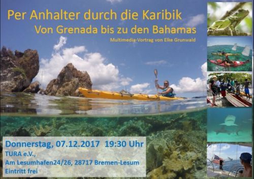 Elke Grunwald und Markus Ziebell berichten am Donnerstag, 7. Dezember, um 19.30 Uhr über die Erlebnisse ihrer sechsmonatigen, rund 3000 Kilometer langen Abenteuerreise von Grenada aus durch die Karibik bis zu den Bahamas. Die Multimedia-Veranstaltung findet im Bootshaus der Kanuabteilung von Tura, Am Lesumhafen 26, statt.
