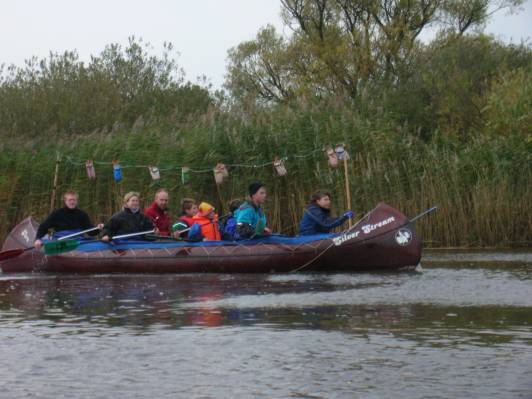 Die Hinfahrt verlief fast reibungslos, wäre da nicht eine Brücke gewesen. Der Lampionmast passte nicht hindurch. Kurzerhand musste der Mast umgelegt werden und dann ging es weiter. Nach einer guten Stärkung in Dammsiel konntedie Rückfahrt mit viel Laternenschein genommen werden. Die Lichter waren weit zu sehen, die Lieder nicht zu überhören und die Stimmung war prächtig. Auch die jüngsten Kanuten haben sich tapfer geschlagen.