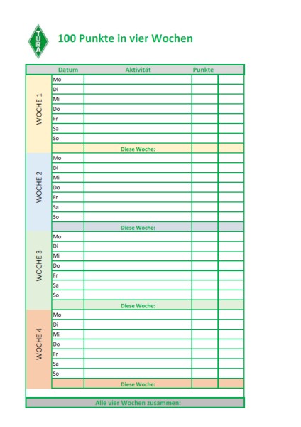 Wer Excel oder ein kompatibles Programm hat, findet hier eine Excel-Tabelle zum Download. In diese könnt ihr eure täglichen Punkte eingeben, die Summen für die einzelnen Wochen und die gesamte Zeit werden automatisch berechnet.