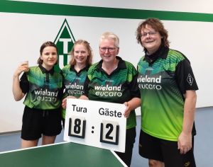 Für den gelungenen Anfang sorgten Nina Wurthmann und Christina Jackwerth im Doppel. Auch in den anschließenden Einzeln spielten die Tura-Damen stark. Mit jeweils 3:0-Sätzen gewannen Christina Jackwerth, Liliia Zakirova und Birgit Meinke ihre Einzel. Beim Zwischenstand von 4:0 ging Nina Wurthmann an den Tisch und musste sich nach einem ebenbürtigen Schlagabtausch mit 2:3 und 10:12 im Entscheidungssatz geschlagen geben.