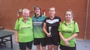 Im Finale kam es dann zu einem echten Krimi. Birgit & Timo vs. Alex & Vincent. Die ersten beiden Sätze konnten Alex & Vincent knapp für sich entscheiden, doch dann begann die Aufholjagd von Birgit & Timo: 2:2 Sätze, die Entscheidung fällt im letzten, 5. Satz. Auch diesen konnten Birgit & Timo für sich entscheiden, drehten das Match nach 0:2 Rückstand komplett und gewinnen mit 3:2 Sätzen (7:11, 10:12, 11:9, 11:8, 11:8) das Finale und den Doppeltitel!