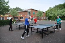 Gesagt, getan – und so trafen sich an einem Montag Spätnachmittag fünf Aktive bei schönem Frühsommerwetter und nur geringem Wind an den beiden Tischtennis-Tischen aus dem Vereinszentrum auf dem Bert-Trautmann-Platz direkt vor dem Vereinszentrum. Für alle Fälle hatten einige ihre Federball-Schläger mitgebracht. Falls es mit dem Wind nun gar nicht klappen sollte.