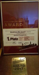 Die "schlemmerblock.de 2:1 Gastronomie-Marketing-Gesellschaft mbH" mit Sitz in Worms hat Jasmin Nanic mitgeteilt, dass sein "Steakhaus Bei Jasmin" im TURA-Vereinszentrum am Bert-Trautmann-Platz (Lissaer Straße 58) in Bremen-Gröpelingen Gewinner des Schlemmerblock-Awards 2017 ist.